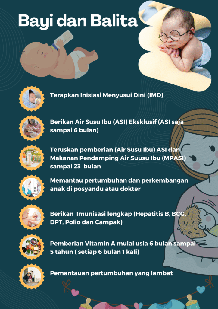 2. Berikan Pendamping ASI mulai umur 6 bulan. Berikan Vitamin A mulai usia 6 bulan sampai dengan usia lima tahun (setiap 6 bulan sekali).